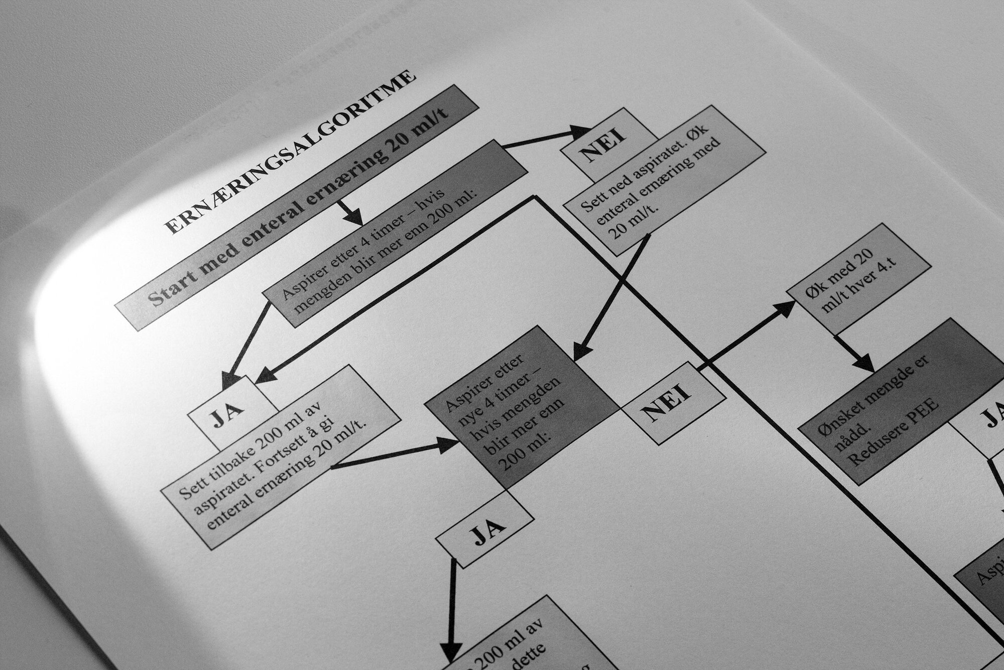 Utarbeidelsen av ernæringsalgoritmen tok utgangspunkt i en australsk studie (34). Ernæringsalgoritmen ble omarbeidet til norske forhold, diskutert tverrfaglig med kollegaer og testet på et annet sykehus enn der studien ble foretatt, for å få evaluert dens lettfattelighet og praktiske anvendelighet. Det var ingen tilbakemeldinger som kunne vise til at Ernæringsalgoritmen hadde uklare punkter. Ernæringsalgoritmen er et flytdiagram i forhold til opptrapping og gjennomføring av enteral ernæring, inkludert et punkt om parenteral ernæring som supplement der den enterale ernæringen ikke er tilstrekkelig. Poenget med protokollen er at personalet følger felles retningslinjer, slik at individuelle avgjørelser som hindrer pasienten i å bli tilført riktig mengde ernæring unngås. Ernæringsalgoritmens effekt ble målt i et kvasieksperimentelt posttest design der 42 respiratorpasienter mellom 18-70 år, med liggetid på tre døgn eller mer, ble fordelt i en sammenligningsgruppe og en eksperimentgruppe. Pasientens diagnose var ikke utvalgskriteriet i studien, begrunnet med at alle pasienter har i utgangspunktet behov for hensiktsmessig ernæring. Pasienter som flyttet fra intensivavdelingen eller døde før det var gått fire døgn, gikk ut av studien. En kort muntlig og skriftlig informasjon om studien ble gitt til leger og sykepleiere i feltet før forordnet og tilført mengde ernæring ble registrert de tre første døgn etter innleggelse hos 21 intensivpasienter som fulgte vanlig praksis (sammenligningsgruppe). Begrensning av informasjon og involvering av personalet var for å sikre korrekte data ved å unngå ekstra fokus på ernæring i denne perioden. Deretter ble de samme ernæringsdata registrert fortløpende hos 21 nye intensivpasienter (eksperimentgruppen) etter innføring og opplæring i ernæringsalgoritmen til hele personalet. Alle pasienter som fylte inklusjonskriteriene inngikk i studien fortløpende. Alle sykepleiere og leger fikk utdelt hver sin Ernæringsalgoritme i laminert lommeformat. I de tilfellene personalet ikke fulgte protokollen ble det fylt ut avviksskjema. Datainnsamling pågikk i totalt fem måneder, inkludert opplæring av personalet. Det foregikk ingen undervisning eller annen fokus på emnet ernæring under hele studieperioden. Resultater fra studien viste at pasientene som fulgte ernæringsalgoritmen fikk både forordnet og administrert signifikant mer ernæring enn pasientene som fulgte vanlig praksis. Effekten var størst i forhold til enteral ernæringsmengde (3). I tillegg førte ernæringsalgoritmen til større konsistens i sykepleiepraksis med tanke på aspirering av ventrikkelinnhold og økning av hastigheten på mengde enteral ernæring per time.