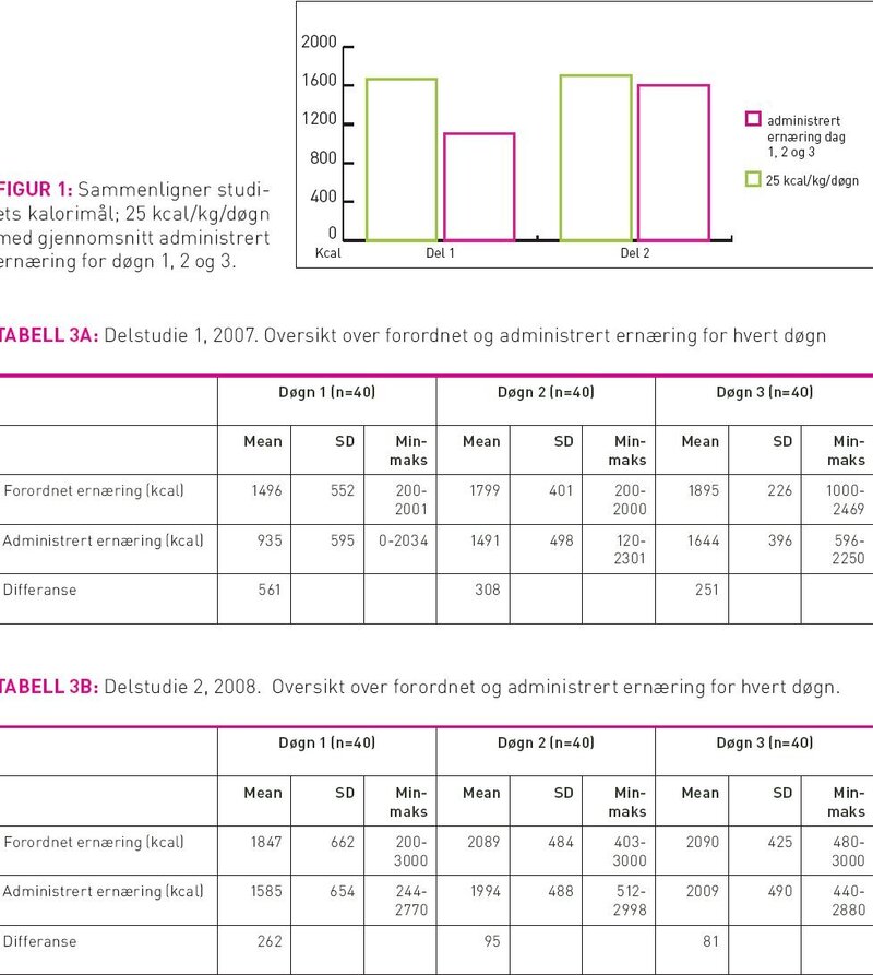 Det finnes mange holdepunkter for at etablert ernæring for intensivpasienten er positivt, og at feilernæring og underernæring i forbindelse med akutt, kritisk sykdom er ugunstig (1-3). Tidlig ernæringsstøtte til intensivpasienten kan bidra til lavere infeksjonsrisiko, redusert liggetid på respirator og redusert antall liggedøgn på sykehus totalt (4-6). Intensivpasienten får i varierende grad dekket sitt ernæringsbehov (7-9). Årsaker kan være sen oppstart av ernæringstilførsel, forordning av ernæringsmengde som ikke står i forhold til pasientens individuelle behov, og /eller patofysiologiske- og praktiske problemer med å tilføre pasienten forordnet mengde ernæring (10-12). Forskning viser at det å ha etablerte ernæringsprotokoller og/eller ernæringsteam kan gi positive effekter i forhold til ernæring av intensivpasientene (3;8;13;14). I 2002 innførte Generell Intensiv på Rikshospitalet en ernæringsalgoritme som medførte at pasientene startet tidligere med ernæring, og fikk forordnet og administrert mer ernæring sammenlignet med tidligere praksis (3). Forskjellen mellom forordnet- og administrert mengde ernæring var imidlertid signifikant, - bare 84, 2 prosent av den forordnede mengde ernæring ble tilført pasienten. I 2007 ble det gjennomført en retrospektiv oppfølgingsstudie (del 1 av 2) som viste ytterligere forbedring i ernæringstilførsel til pasientene, men at det fortsatt ble administrert signifikant mindre ernæring (kalorier) enn det som ble forordnet, og at forordningene var for lave sammenlignet med det litteraturen anbefaler for intensivpasienter. Ut ifra data fra studiene i 2002 og 2007 kom pasientens vekt og individuelle behov opp som viktige variabler å fokusere på. Som en ny oppfølgingsstudie (del 2 av 2) til innføring av ernæringsalgoritmen, ble det i 2008 gjennomført en prospektiv kartleggingsstudie ved samme avdelingsenhet. Hensikten var å se i hvilken grad intensivsykepleiere nådde målet om tilfredsstillende ernæringstilførsel til den kritisk syke pasient etter at enkelte rammebetingelser var etablert de siste årene. Intensivsykepleierne har ett til to års videreutdanning i intensivsykepleie og som oftest ansvaret for kun en pasient per vakt, mulighet til å følge pasienten gjennom intensivoppholdet og dermed tilstrekkelig tid og kunnskaper til å prioritere ernæring. Generell Intensiv har en ernæringsprotokoll som er rutinemessig godt innarbeidet, og som gir føringer for tidspunkt for oppstart og praktisk gjennomføring av ernæringen. Forskningsspørsmålene i oppfølgingsstudie del 2 er som følger: 1. Er det forskjell mellom forordnet- og administrert mengde ernæring (kalorier) hos intensivpasientene? 2. I hvilken grad får intensivpasienten dekket sitt individuelle behov for ernæring (kalorier) de tre første døgn etter innleggelse i intensivavdeling?