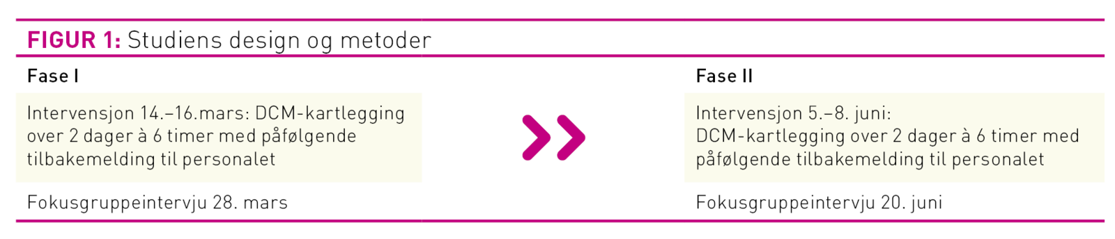Studien foregikk i en sykehjemsenhet og har et beskrivende design der fokusgruppeintervjuer ble brukt som metode for datasamling (se figur 1). I forkant av intervjuene ble det med tre måneders mellomrom gjennomført DCM-kartlegginger over to fortløpende dager à seks timer, med påfølgende tilbakemelding til personalet. DCM-prosessen fungerte på denne måten som en intervensjon i studien (3).