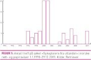 Illustrasjonen viser hvordan diskusjonen toppet seg i 2000 og 2001. Vi ser også at temaet vekket ny interesse rundt 2005, med en topp i 2007, og at det igjen er aktuelt i 2011. Frasen «sykepleiere fra utlandet» er et snevert søkebegrep som sikrer få irrelevante treff. I søket har jeg fjernet treff som inneholdt ordet «korrupsjon», fordi dette ordet ga mange identiske treff på én sak.