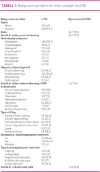 Av 291 utsendte spørreskjema ble 218 spørreskjema besvart og returnert. Dette utgjør en svarprosent på 75 prosent. Tabell 1 viser en oversikt over demografiske variabler samt deltakelse i kunnskapsbaserte  nettverk. Cronbachs alfa ble i denne studien målt til 0,86 for KBP holdningsskala, og 0,87 for KBP implementeringsskala.