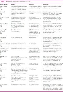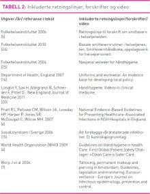 13 artikler ble inkludert i studien. Av disse er fem oversiktsartikler og åtte er enkeltstudier med ulik kvantitativ design. Tabell 1 viser en oversikt over inkluderte studier, studiedesign, størrelse og resultater. Vi fant åtte nasjonale og internasjonale retningslinjer og forskrifter om smittevern (4-7,14,15, 24, 25) som ble inkludert. Hensikten med å inkludere retningslinjer i studien var å se hvilke bestemmelser og begrunnelser disse hadde knyttet til arbeidsantrekk. Retningslinjene har utfyllende referanselister og man har også beskrevet hvordan artikkelsøkene ble utført (6). Folkehelseinstituttet anbefalte en video om håndhygiene fra New England Journal of Medicine (20). Tabell 2 viser en oversikt over inkluderte retningslinjer, forskrifter og video.