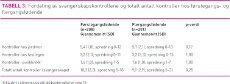 Det var ingen forskjeller mellom første- og flergangsfødende, verken når det gjaldt antall kontroller eller hvordan de var fordelt (tabell 3). Kvinnene som ble vurdert til å være risikofødende ved innleggelse i fødeavdelingen, hadde gjennomsnittlig flere kontroller hos fastlegen og i spesialisthelsetjenesten enn kvinnene som ble vurdert til å være normalfødende (tabell 4). Til sammen 145 (35 prosent) av kvinnene ble henvist til kontroll i fødepoliklinikk i tillegg til rutinemessig ultralydundersøkelse. Av disse hadde 84 (21 prosent) kun en kontroll ved sykehuset. (Se tabell 3 og 4.)