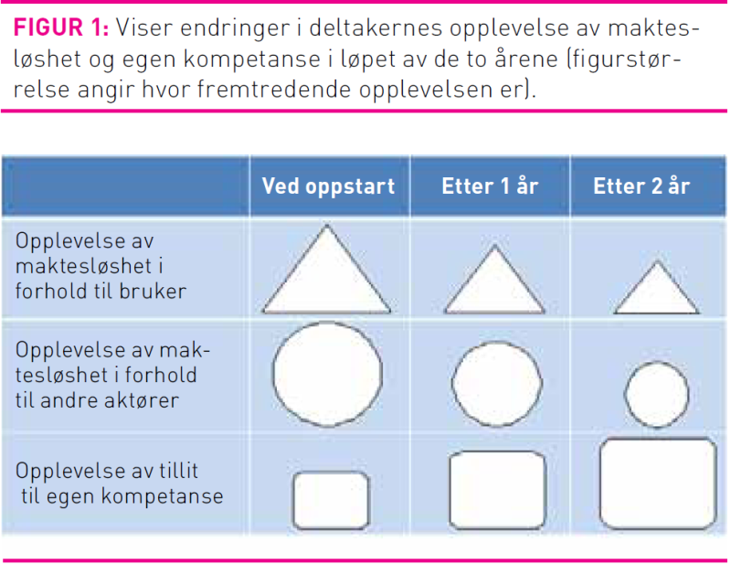 Ved prosjektets oppstart meddelte en av deltakerne seg slik: «Jeg er nesten alltid usikker på om det jeg har gjort er bra og riktig. Jeg føler meg usikker på min egen kompetanse … Vet ikke om mine vurderinger er riktige». Etter to år beskrev hver av deltakerne en personlig utvikling, fra faglig usikkerhet og liten tillit til egne vurderinger mot større trygghet og tillit til egen kompetanse. Dette ble illustrert gjennom en fortelling der en deltaker hadde fått vite at en bruker hadde det vanskelig. Hun visste at hun skulle inn i leiligheten og snakke med vedkommende. Hun sa: «Før var jeg alltid usikker på hva jeg skulle si. Nå går jeg inn og har mer tillit til meg selv, og da går samtalen mye lettere. Jeg kan faktisk gå ut etterpå og tenke at dette gikk veldig bra. Og sånn hadde jeg det i alle fall ikke for to år siden. Så jeg har utviklet meg. Jeg føler meg mye tryggere».