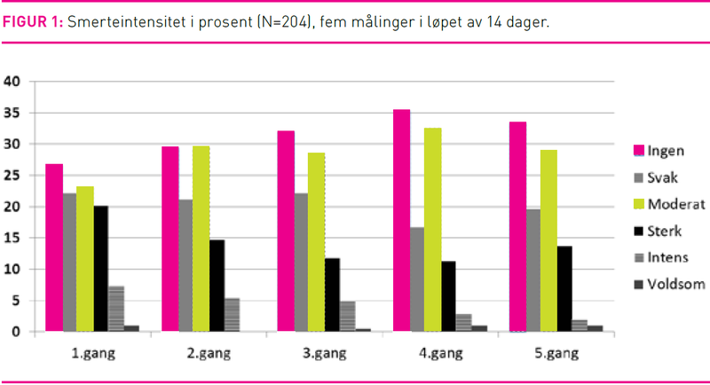 Oversikt over smerteintensitet over tid, for de fem målingene som ble gjort i løpet av 14 dager, vises i figur 1. Vi har beregnet at 94 pasienter (46 prosent) i utvalget har oppgitt smerte på alle fem måletidspunktene, og det er samme gruppe pasienter som er registrert hver gang. Siden figur 1 viser smerteskår på gruppenivå, kan det være enkelte pasienter som har skåret smerte på ett måletidspunkt og ikke-smerte på et annet tidspunkt.