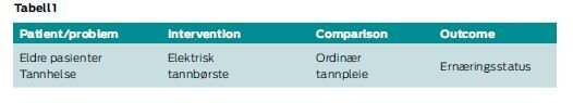 I undervisningen i alle tre studieår vektlegger både bibliotekarer og faglærere bruk av et rammeverk, PICO (Patient /problem, Intervention, Comparison og Outcome) som skal forenkle prosessen med å finne relevante søkeord. Tema eller spørsmål knyttet til kliniske problemstillinger deles opp og aktuelle begrep (se eksempel i tabell 1) settes inn i en PICO-struktur for at det skal være enklere å komme fram til relevante søkeord (7).