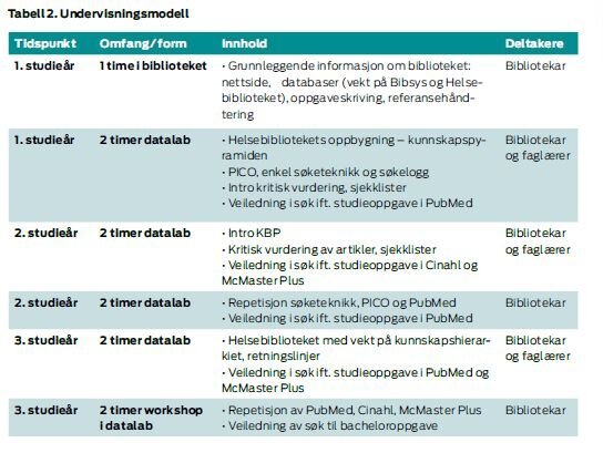 Sykepleierutdanningen skal utdanne reflekterte, selvstendige og ansvarsbevisste sykepleiere. Kritisk analyse av egen og andres tjenesteutøvelse fordrer blant annet at man erkjenner informasjonsbehov både i teori og praksis. I vår modell knyttes bibliotekundervisningen direkte til en studieoppgave som er rettet mot relevante faglige problemstillinger i praksis i de ulike kursene. Faglærer er med i undervisningen halvparten av tiden. Hensikten er å bistå studentene og bibliotekarene med sykepleiefaglig kunnskap som kan fremme refleksjon og evnen til å komme frem til relevante og gode søkeord.