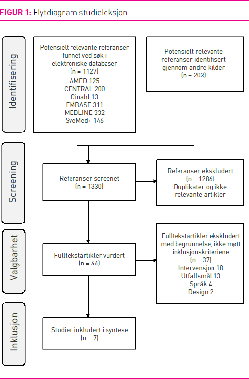Vi fant 1330 potensielt relevante referanser. 44 artikler ble gjennomgått i fulltekst, og av disse ble 37 ekskludert (figur 1). Syv studier (23–29) ble inkludert, og disse studienes egenskaper presenteres i tabell 2.
