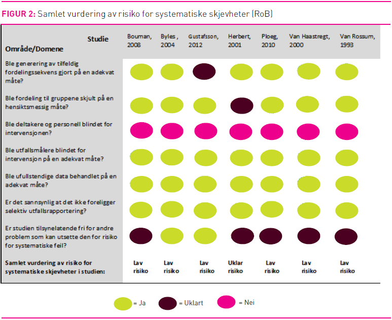 Førsteforfatter vurderte risiko for skjevheter eller systematiske feil i de enkelte studiene ved hjelp av «The Cochrane Collaboration’s tool for assessing risk of bias (RoB)» (20). Randomiseringsprosessen, hvordan ufullstendige eller manglende data er behandlet i de inkluderte studiene og hvordan intervensjonen er gjennomført, ble særlig vurdert. En samlet vurdering ble lagt til grunn for å avgjøre om studiene hadde lav, uklar eller høy risiko for systematiske feil (20).