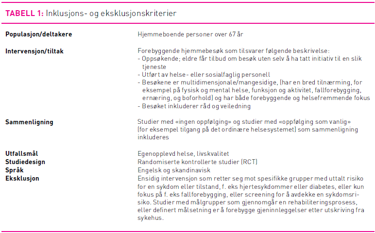 Vi inkluderte randomiserte kontrollerte studier publisert på engelsk eller skandinavisk, som omhandler hjemmeboende eldre over 67, forebyggende hjemmebesøk og egenopplevd helse og/eller livskvalitet. Studier der hjemmebesøket retter seg mot spesifikke grupper ble ekskludert (tabell 1).
