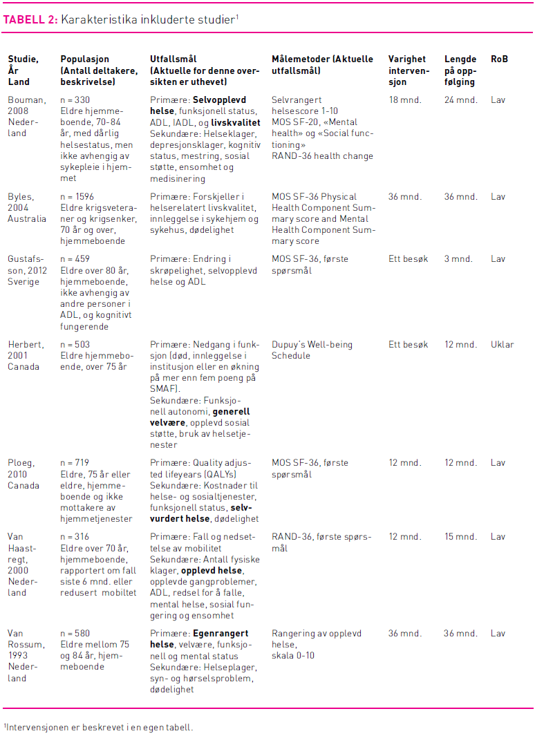 Til sammen deltok 2404 eldre i de fem studiene og gjennomsnittsalderen på deltakerne varierte fra 75,5 år (23) til 86 år (25). Alle deltakere var i risikosonen for funksjonsfall eller hadde allerede noen funksjonsvansker, men deltakerne var ikke sterkt hjelpetrengende fysisk eller mentalt. Ingen av studiene inkluderte deltakere som jevnlig mottok sykepleie i hjemmet, og fire studier ekskluderte også de som mottok annen hjelp i hjemmet (25,27–29).