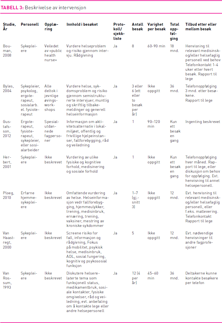 Forebyggende hjemmebesøk er gjennomført forskjellig i de ulike studiene, og består av ulike former for individuell vurdering av helsestatus og sykdomsrisiko, samt rådgivning, generell helseinformasjon, rapport til lege eller eventuelt henvisning til andre instanser (tabell 3). Intervensjonsgruppene ble sammenliknet med kontrollgrupper som ikke fikk forebyggende besøk.