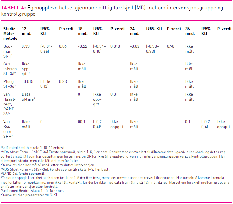 Egenopplevd helse ble målt ved rangeringer av egen helse på ulike skalaer. Første spørsmål av «Medical Outcome Study Short Form-36» (SF-36) ble brukt i tre av studiene (25,27,28), og to studier (23,29) brukte rangering av egen helse på skala 1–10 uten å oppgi om dette var hentet fra et spesifikt måleinstrument. En av de fem studiene viser til signifikant resultat (25). Gustafsson m.fl. 2012 (25) oppgir en odds ratio (OR) for ikke å ha forverret tilstand tre måneder etter tiltaket på 2,21 (95 prosent KI: 1,12–4,37, p-verdi 0,02) i favør av gruppen som har hatt hjemmebesøk. Dette viser at halvparten så mange i intervensjonsgruppen har hatt en forverring i sin egenopplevde helse sammenliknet med kontrollgruppen, etter tre måneder.