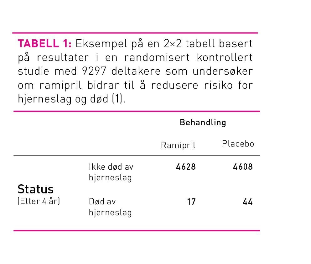 Blodtrykkstudien nevnt over er en stor studie der forfatterne fordelte nesten 10.000 pasienter i to grupper som fikk henholdsvis ramipril og narremedisin (1). De målte om blodtrykket endret seg, men registrerte også hvor mange som døde av hjerneslag i hver av de to gruppene mens studien pågikk. Disse resultatene kan oppsummeres av fire enkeltstående tall i en 2×2 tabell (se tabell 1). Med bare fire tall tilgjengelig skulle en kanskje tro at mulighetene for å drive analyse og tallmagi er begrenset, men som vi skal se kan disse fire tallene kombineres på veldig mange måter og forvolde en del hodebry.