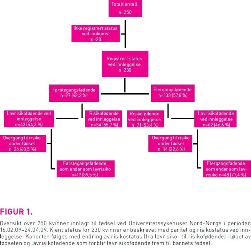 Denne studien beskriver en kohort hvor alle innlagt til fødsel i perioden 16.02.09–24.04.09 ble inkludert, til sammen 250 kvinner. Av disse var 230 kvinner registrert med paritet og klassifisert som enten lavrisiko- eller risikofødende ved innleggelse. Lavrisikofødende ble definert som friske kvinner med ett barn i hodeleie, spontan fødselsstart mellom svangerskapsuke 37 og 42 og lavrisiko frem til etter barnets fødsel (5). Flergangsfødende skulle i tillegg ha født normalt tidligere. Data ble hentet fra «Helsekort for gravide» og Kvinneklinikkens fødedataprogram «Partus», versjon 3.2.0., som har en egen fil for seleksjonsdata (Clinsoft; Clinical software, Oslo, Norway).