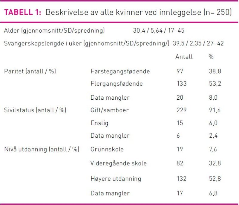 Kvinnene (n=250) var i alderen 17–45 år med gjennomsnittsalder på 30,4 år (SD 5,64). De førstegangsfødende var gjennomsnittlig 27,7 år (SD 5,55) og de flergangsfødende 32,4 år (SD 4,81). Fødslene skjedde mellom svangerskapsuke 27–42, i gjennomsnitt i uke 39,5 (SD 2,35). Storparten (91,6 prosent) var registrert som gift og/eller samboende og 52,8 prosent av kvinnene hadde høyere utdannelse (tabell 1).