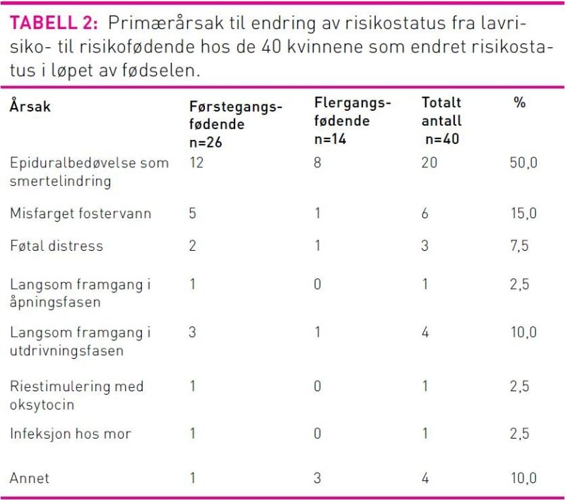 Nær dobbelt så mange førstegangsfødende (n=26) som flergangsfødende (n=14) i lavrisikogruppen endret status i fødselsforløpet (figur 1). Det vil si at 38,1 prosent totalt endret status. Endringen skjedde ved gjennomsnittelig 6,5 cm åpen mormunn (SD 2,33). Den vanligste årsaken var behov for epiduralbedøvelse, andre årsaker var føtalt distress, misfarget fostervann og langsom framgang i fødselen (tabell 2). Av de 40 kvinnene som av ulike årsaker gikk over til å være risikofødende under fødselen, fikk 13 førstegangsfødende og ni flergangsfødende epiduralbedøvelse. Atten av disse ble i tillegg riestimulert med oksytocin, det vil si at 81,8 prosent av friske kvinner som startet som lavrisikofødende og som mottok epiduralbedøvelse også ble oksytocinstimulert. Totalt 26 kvinner (24,8 prosent) som startet som lavrisikofødende ble stimulert med oksytocin. Førstegangsfødende sto for størsteparten av dette (18 kvinner/69,2 prosent). Åpningstiden for førstegangsfødende var i gjennomsnitt 8,0 timer (SD 4,5), og utdrivningstid var 41,6 min (SD 23,6), for flergangsfødende 3,8 timer (SD 2,6), og utdrivningstid var 20 min (SD 21,9). Det var ingen signifikant forskjell i antall timer i aktiv fødsel (p=0,296 to-utvalgs t-test), heller ikke i aktiv utdrivningstid (p=0,468 to-utvalgs t-test) mellom lavrisikofødende og risikofødende.