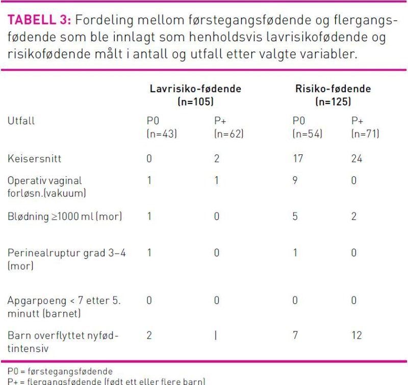 Resultater: Det var 97 førstegangsfødende (42,2 %) og 133 flergangsfødende (57,8 %). Av disse var 105 lavrisikofødende (45,7 %) og 125 risikofødende (54,3 %). Andelen lavrisikofødende som fødte uten intervensjon og forble i lavrisikogruppen var 61,9 %. Andelen som endret risikostatus under fødselen var 38,1 %, halvparten på grunn av epiduralbedøvelse som smertelindring. I lavrisikogruppen ble 1,9 % forløst ved hjelp av vakuum og 1,9 % med keisersnitt, 96,2 % av kvinnene fødte spontant. I risikogruppen ble 7,2 % forløst ved hjelp av vakuum og 32,8 % med keisersnitt. Andelen kvinner som fikk sfinkterruptur var 0,9 % i begge gruppene. Ingen barn fikk apgarpoeng < 7 etter 5 minutter. Overflytning til nyfødtintensiv var 2,9 % i lavrisikogruppen, 15,2 % i risikogruppen.
