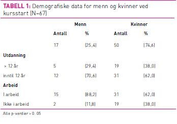 Hos mennene i utvalget var gjennomsnittsalderen ved baseline 43,8 år (standardavvik 8,8 år), mens den var 43,2 år (standardavvik 10,8 år) for kvinnene. De fleste var kvinner og en større andel menn enn kvinner var i arbeid, ingen statistisk signifikante forskjeller mellom kvinner og menn ble funnet. Gjennomsnittlig skåre for mestringsforventning blant menn var 28,0 (standardavvik 6,5), mens tilsvarende skåre for kvinner var 26,2 (standardavvik 6,7). Gjennomsnittlig skåre for selvfølelse blant menn var 11,2 (standardavvik 2,3), mens tilsvarende skåre for kvinner var 10,5 (standardavvik 2,9). Endringer i selvfølelse og mestringsforventning fra kursstart til ettårs oppfølgingen (Tabell 2) var statistisk signifikante og endringene var klinisk signifikante.