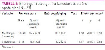 Hensikt: Undersøke endringer i mestringsforventning og selvfølelse hos kursdeltakerne ett år etter fullført kurs.