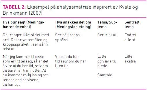 Vi benyttet en beskrivende temasentrert analysemetode i fire trinn inspirert av Kvale og Brinkmann (20). Dette ga oss muligheten til å gå i dybden på enkelte temaer. Vi startet intervjuet med oppklarende spørsmål og oppsummeringer av svarene på disse, slik at informanten kunne bekrefte eller avkrefte utsagnene. Etter nøye gjennomlesing av teksten som helhet, ble tekst som ikke var relevant satt til side. Den gjenværende teksten ble foreløpig grovsortert i meningsbærende enheter (trinn en) ut fra hovedområdene i intervjuguiden. Disse meningsbærende enhetene ble fortettet til kortere enheter om hva teksten handler om (trinn to – meningsfortetning). Gjennom flere gjennomlesninger ble meningsforteningene forsøkt sortert i et mønster av tema og undertemaer (trinn tre). Siste trinn i analysen var å rette et reflekterende blikk på informantenes utsagn og utvikle sentrale temaer. Tematiseringen ble organisert i et matriseskjema (se tabell 2) ut fra informantenes utsagn slik forskerne fortolket dem (20). Første forfatter transkriberte seks intervjuer og andre forfatter fire. Materialet er i sin helhet lest gjentatte ganger av første og annen forfatter. Tredjeforfatter leste et intervju i sin helhet samt kontrollerte utdrag fra den kondenserte teksten og sammenliknet med transkribert tekst. (Se tabell 2.)
