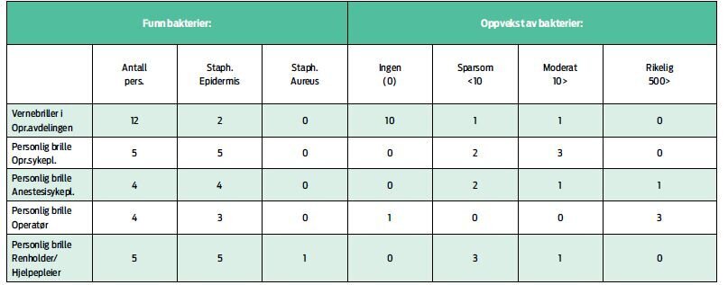 brille i operasjonsavdelingen. Formålet var å vurdere bakteriell