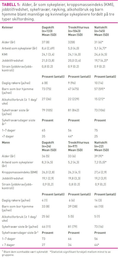 2059 sykepleierne svarte på spørreskjemaundersøkelsen. I alt 1321 kvinner og 143 menn jobbet enten bare dag, bare natt eller treskift-turnus, og ble inkludert i studien, (tabell 1).