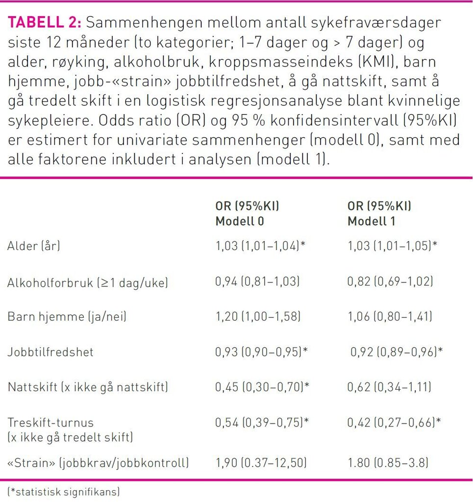 Analysen viste også at det var en positiv sammenheng mellom antall sykefraværsdager og alder. Sammenhengen mellom antall sykefraværsdager og jobbtilfredshet var negativ. Den univariate analysen av skiftarbeid viste at nattskiftarbeid var positivt assosiert med høyt antall sykefraværsdager, men når det ble justert for jobbtilfredshet, forsvant denne sammenhengen (tabell 2, modell 0 og 1).