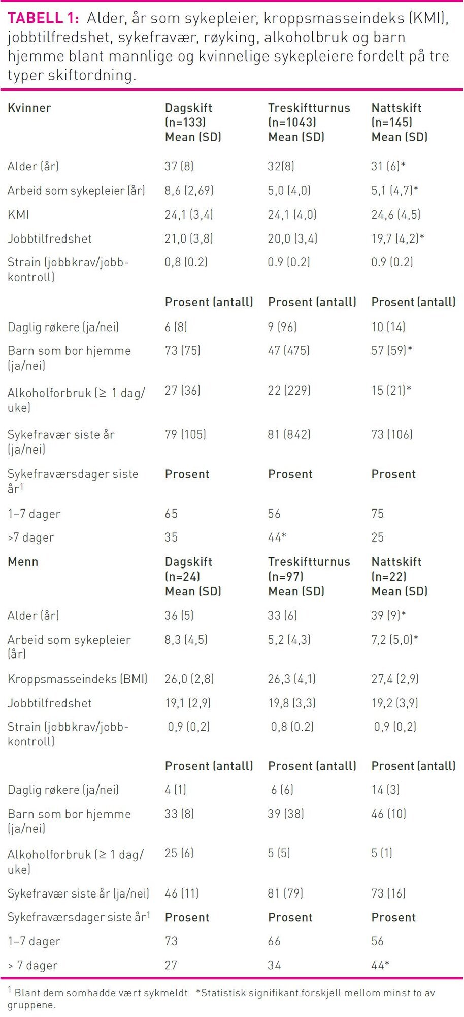 Gjennomsnittsalderen var høyere for kvinner med dagskift enn for dem som arbeidet treskift-turnus og fast nattskift (ANOVA, p<0,001), og det samme gjaldt antall år som sykepleier (tabell 1). En signifikant større andel kvinnelige sykepleiere med fast dagskift hadde barn boende hjemme enn i de andre skiftgruppene (khikvadrattest, p<0,001). De som arbeidet nattskift hadde et lavere alkoholforbruk enn de andre gruppene (khikvadrattest, p= 0,03). Røyking og KMI var likt fordelt i de tre skiftgruppene.