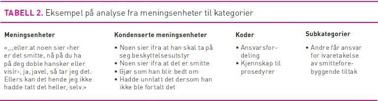 Første trinn i analyseprosessen var å lese gjennom hele det transkriberte intervjumaterialet for å danne et helhetsinntrykk. Det neste trinnet var å bestemme meningsenheter og å forkorte dem til kondenserte meningsenheter, som deretter ble sammenfattet og gruppert til et høyere nivå (abstrahert). Ved neste trinn i analyseprosessen ble det vurdert likheter og ulikheter i koder, og det ble abstrahert i underkategorier videre til kategorier.