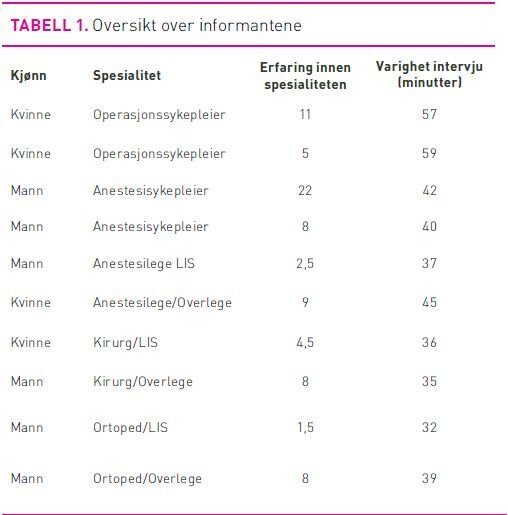 Intervjuene ble foretatt på sykehuset, utenfor operasjonsavdelingens lokaler, i informantens arbeidstid. Dette for å sikre rekruttering til studien. Åtte intervjuer ble gjennomført med begge forfattere til stede, mens to av intervjuene ble gjennomført av henholdsvis operasjonssykepleier (overlege anestesi) og anestesisykepleier (overlege kirurg).