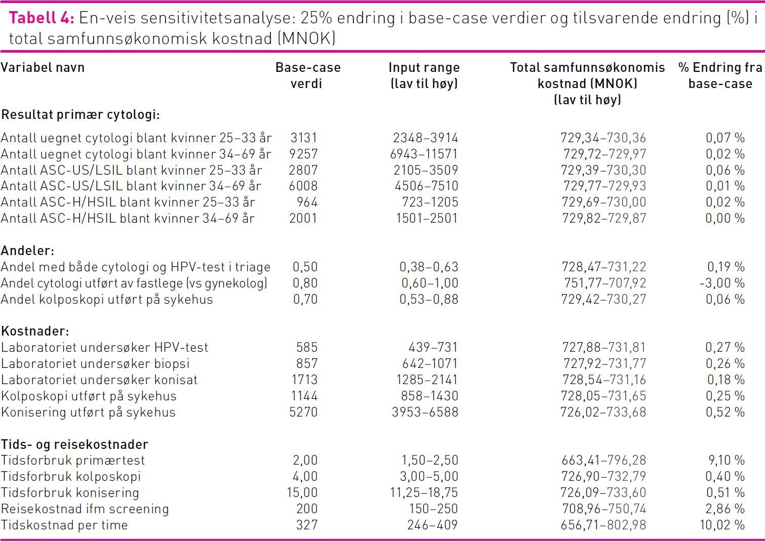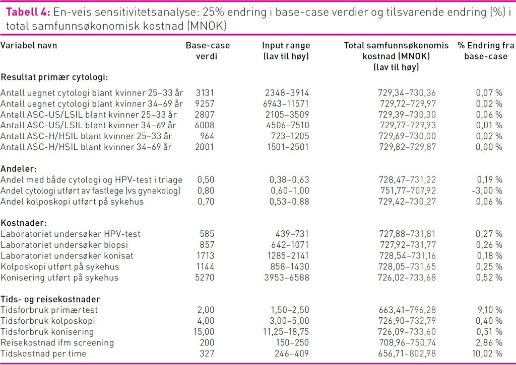 Av de 19 variablene vi gjorde sensitivitetsanalyse på, ga endringer bare i fire variabler mer enn 1 prosent endring i de totale samfunnsøkonomiske kostnadene. Endring i andel cytologi utført av fastlegen ga opptil 3 prosent endring, antall timer arbeidsfravær medført til primærprøve ga 9 prosent endring, reisekostnad ga 3 prosent endring og pasientenes tidskostnad per time ga 10 prosent endring (tabell 4).