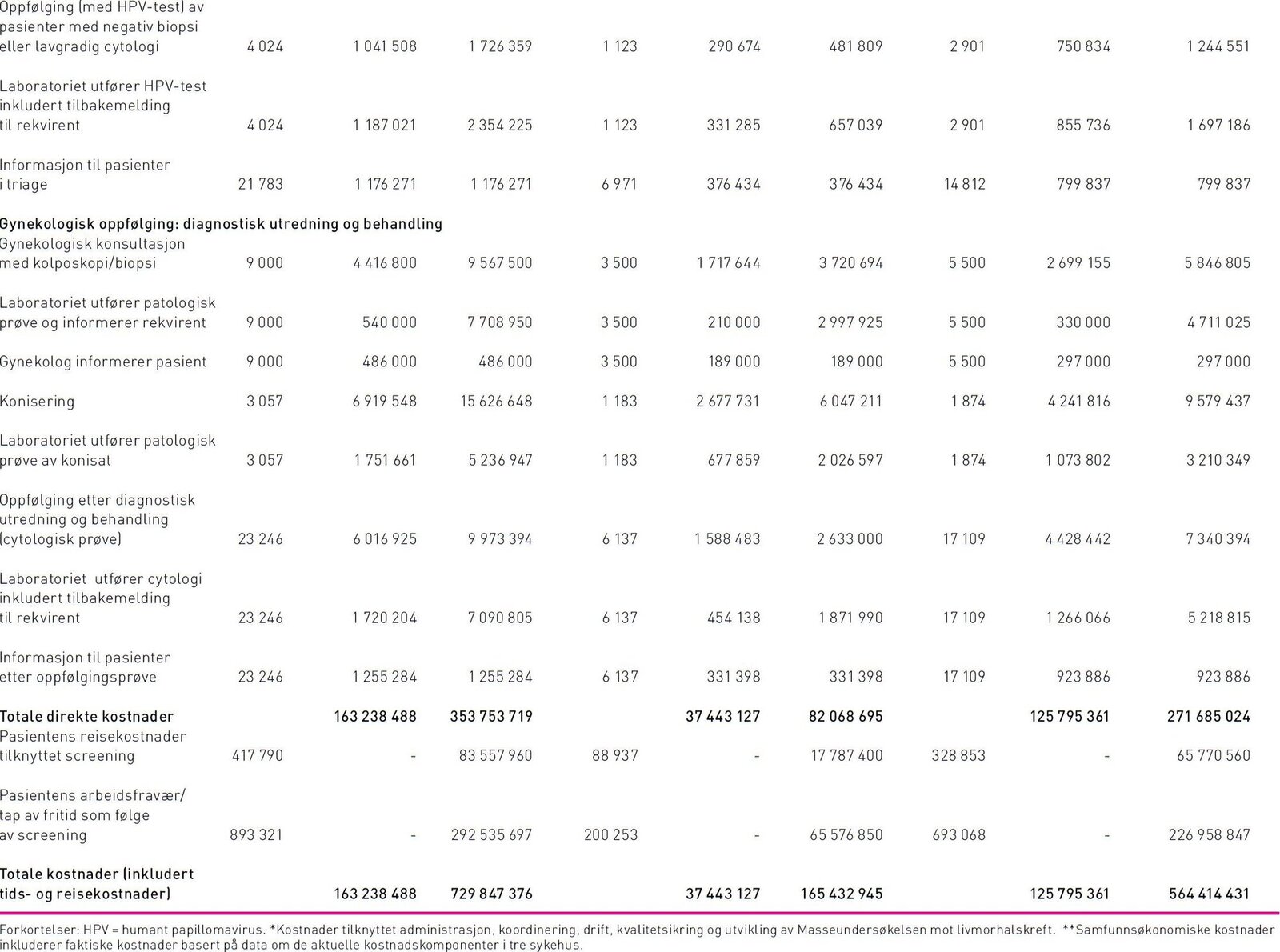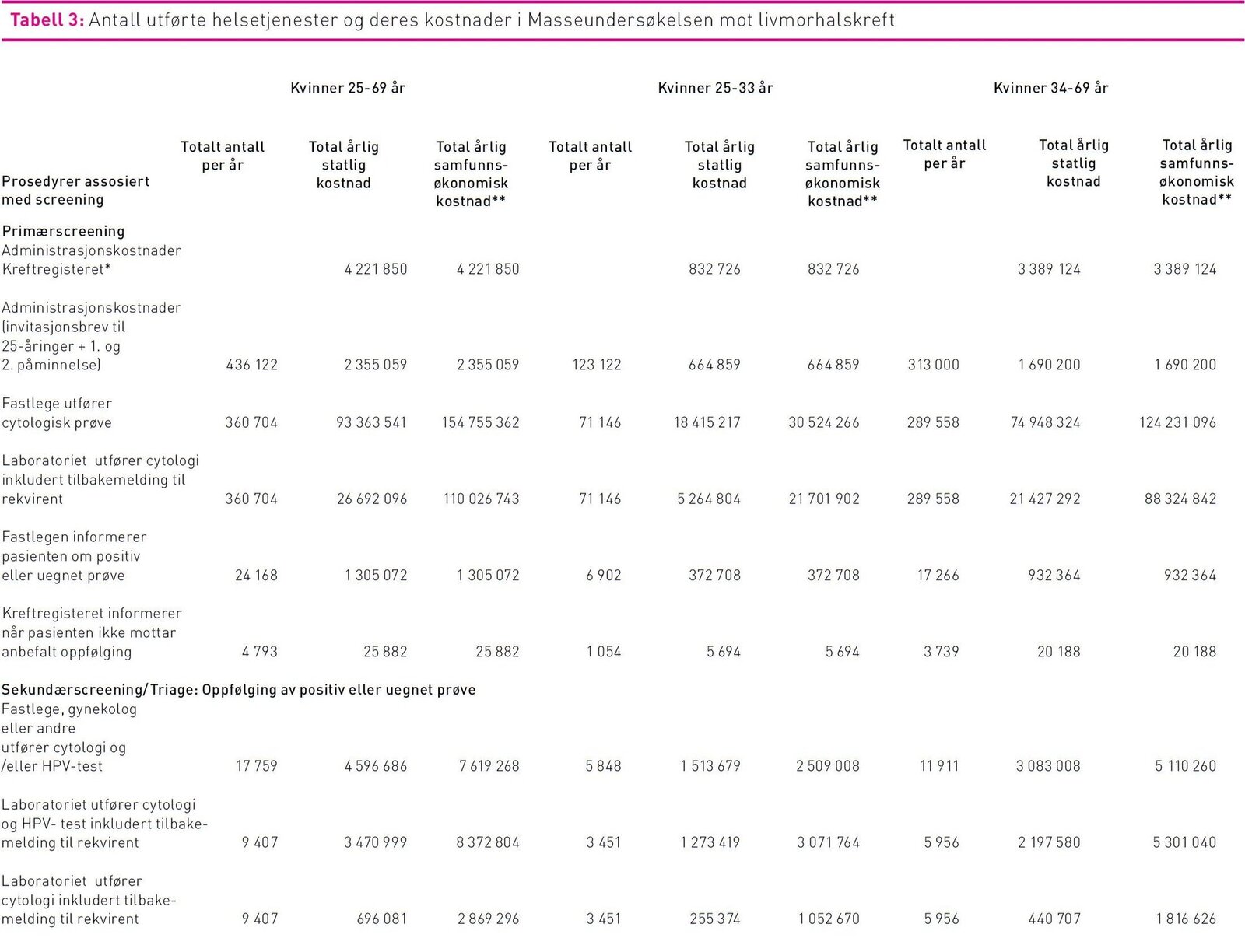Resultater: I 2011 ble det utført i alt 360 704 primærscreeningprøver, som med våre beregninger ville medføre 21 783 nye etterundersøkelser. Det ble innsendt biopsier for omtrent 9000 kvinner, og 3057 kvinner fikk utført konisering. De samlete samfunnsøkonomiske kostnader ved screeningprogrammet var 730 millioner kroner, hvorav 52 prosent utgjorde indirekte kostnader i form av reisekostnader og fravær fra arbeid. Statens direkte utgifter utgjorde 163 millioner kroner.