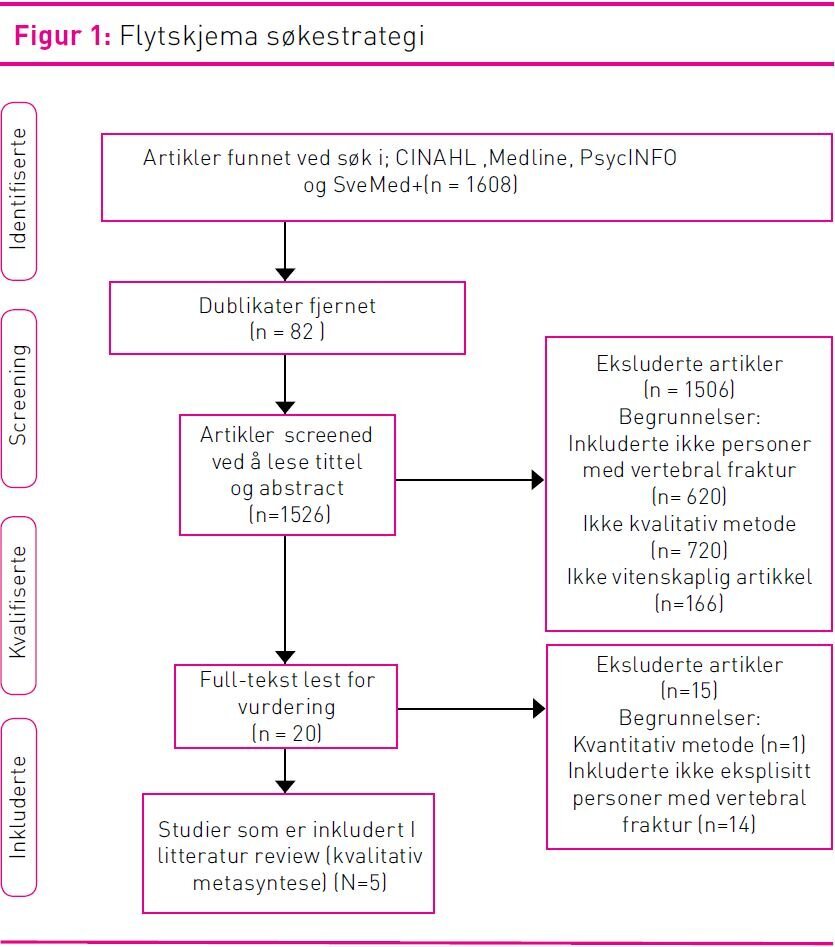 Dublikate ble fjernet. Alle titler og abstrakter ble screenet og artikler som ikke møtte inklusjonskriterier ble ekskludert. Etter screening av titler og abstrakter kvalifiserte 20 artikler for fulltekstlesing. Referanselisten i disse 20 ble screenet for aktuelle studier med tanke på mulig inkludering uten at nye aktuelle studier ble funnet. Fulltekstlesingen resulterte i inklusjon av fem artikler i studien. Hovedgrunnene for å ekskludere artikler var: ikke relevant tema, ikke kvalitativt studie og ikke spesifikt identifiserte kvinner med vertebralfraktur.