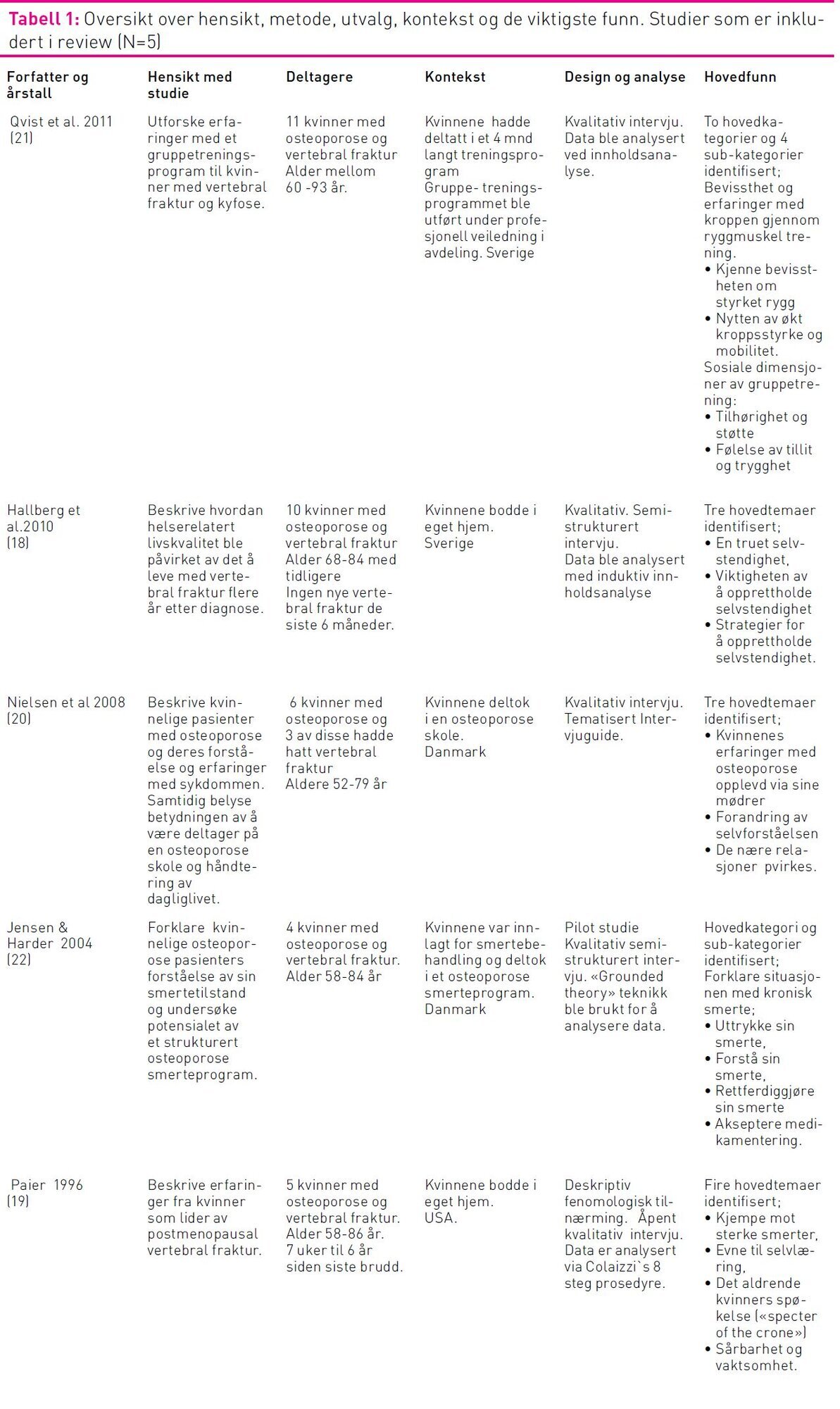 Studiene var publisert i tidsperioden 1996 til 2011. Kvinnene i de fem primærstudiene var i alderen 58 til 90 år. Oversikt over studienes hensikt, metode, utvalg, kontekst og de viktigste funn er presentert i tabell 1.