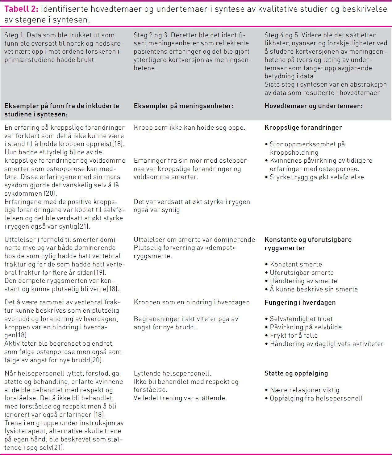 Funn beskrevet i artiklenes abstrakt, resultatdel og diskusjonsdel ble inkludert i datagrunnlaget for syntesen av de fem primærstudiene. Data som ble trukket ut som funn er nedskrevet og formulert tett opp mot ordene forskeren hadde brukt. Tematisk analyse innebærer det å identifisere betydelige eller tilbakevendte temaer i litteraturen og summere funnene fra de ulike studiene under tematiske overskrifter (16). Syntese av data i denne studien fulgte fem steg for tematisk analyse beskrevet av Leegaard og Fagermoen (17). Tabell 2 viser beskrivelse av stegene i syntesen og identifiserte temaer og undertemaer.