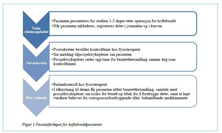 Ved rutinekontroll hos fysioterapeut tre måneder etter bruddet, fikk pasienter en konsultasjon med en sykepleier. Sykepleier startet med å spørre nærmere om situasjonen rundt selve fallet og benyttet en standardisert sjekkliste for å identifisere risikofaktorer for osteoporose og fall. Hun tok også en beintetthetsmåling. Resultatene av målinger ble vurdert sammen med en revmatolog. Pasientene fikk anbefalinger om behandling eller forebygging av osteoporose og fall, samt råd om ernæring, fysisk aktivitet og generell livsstil. De kvantitative dataene ble behandlet med statistikkprogrammet SPSS versjon 21.