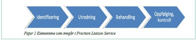I flere land har man kunnet vise til gode og lovende resultater med å opprette «Etter bruddet-poliklinikk («Fracture Liaison Service») med en sykepleier som koordinator (7,11–13). Begrepet «liaison» betegner en person som fungerer som bindeledd mellom ulike grupper. I denne sammenhengen er gruppene forskjellige fagpersonene fra ulike nivåer i helsetjenesten, og som alle deltar i oppfølgingen av hoftebruddpasienten. De viktigste elementene i en «Fracture Liaison Service» illustreres i figur 2.