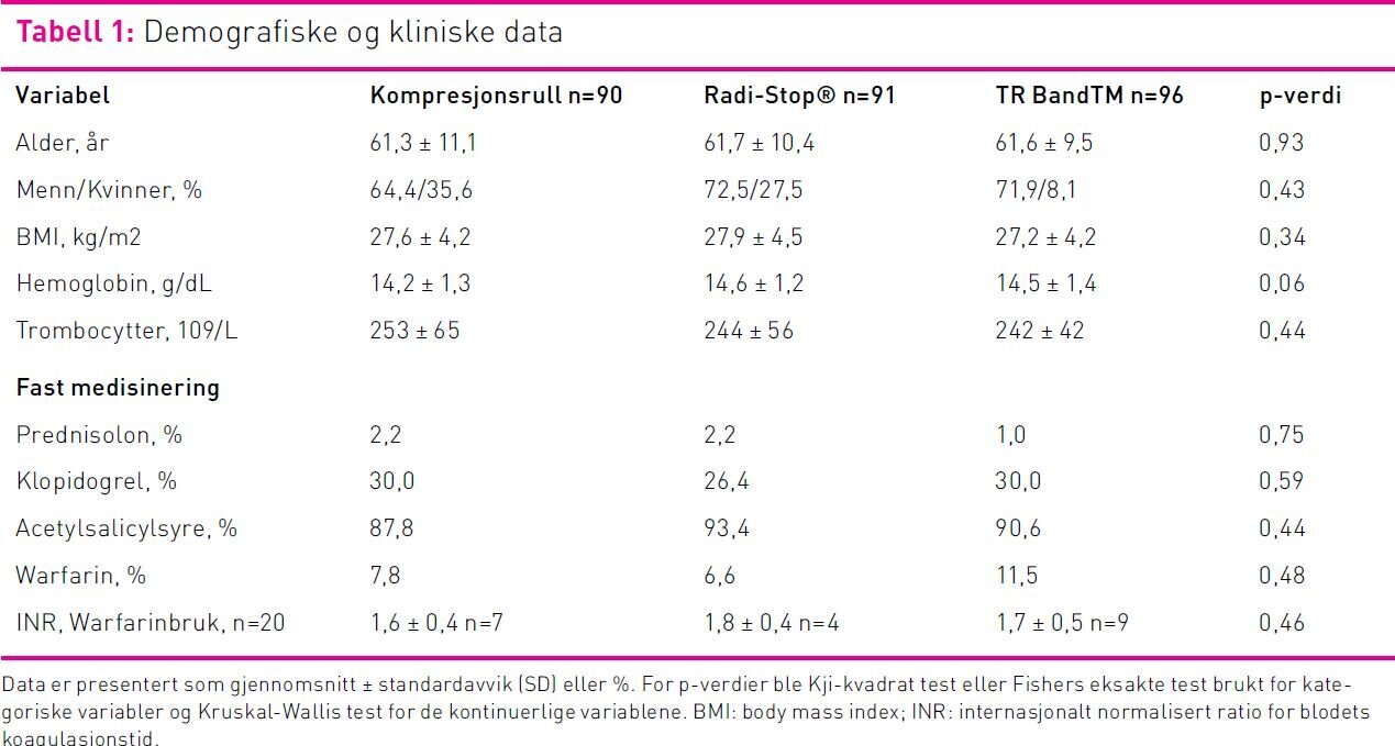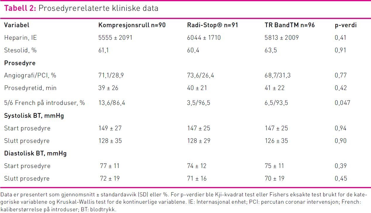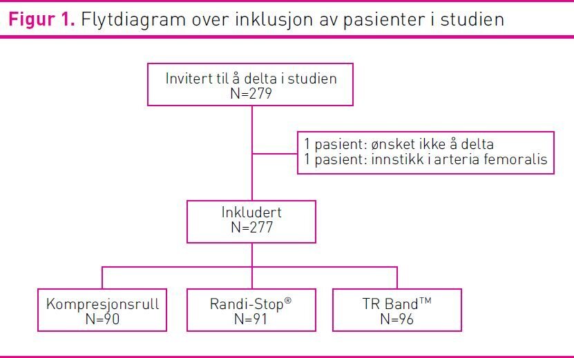 Totalt ble 277 pasienter inkludert i studien. Ved randomisering ble pasientene jevnt fordelt mellom de tre intervensjonene kompresjonsrull, Radi-Stop® og TR BandTM. De tre intervensjonsgruppene var likt fordelt ut fra hvilke pasienter som gjennomgikk koronar angiografi eller PCI. Koronar angiografi og PCI-prosedyrene varte i drøyt 70 minutter og det var ingen forskjell i intervensjonstiden mellom de tre kompresjonsgruppene (tabell 2). Det var flere menn (70 prosent) enn kvinner i studien. Det var ingen signifikante forskjeller mellom intervensjonsgruppene på kjønnsfordeling, alder, BMI eller aktuelle blodverdier (tabell 1). Det var ingen forskjell mellom de tre gruppene i generelt medikamentbruk som kunne tenkes å påvirke blødning (tabell 1). Det var imidlertid flere av pasientene som ble randomisert til kompresjonsrull hvor det ble brukt introduser med størrelse 5F (1,7mm) (p=0,047). Etter avsluttet prosedyre, ble introduser fjernet, valgt kompresjonsmetode satt på og fiksert av sykepleier eller radiograf.