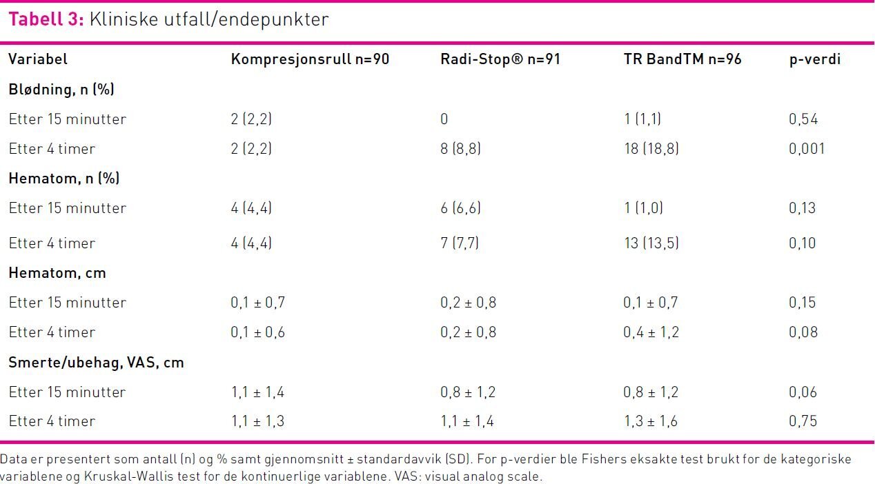 Sykepleier registrerte data fra de tre kliniske endepunktene blødning, hematom og smerte eller ubehag 15 minutter etter at kompresjonen ble satt på og etter fire timer ved kompresjonsfjerning.