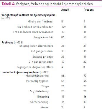 Konklusjon: Pasienter i hjemmesykepleien mottar en rekke ulike typer uformelle omsorgstjenester som i all hovedsak er praktisk bistand. I tillegg indikerer studien at det er en sammenheng mellom en økning i pasienters omsorgsbehov og omfanget av formell og uformell omsorg.