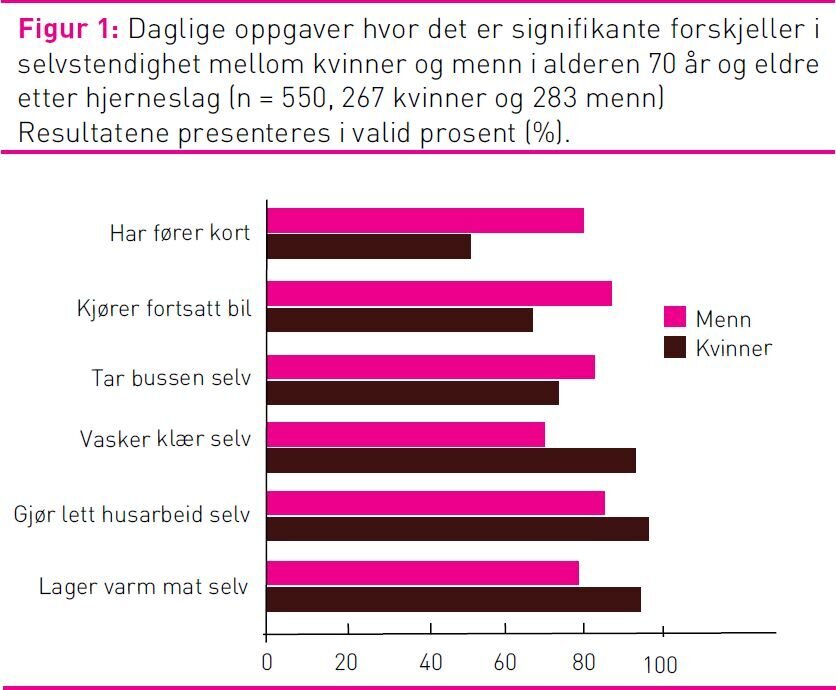 I et kjønnsrolleperspektiv er det ikke spesielt overraskende at flere kvinner enn menn rapporterte at de mestret å vaske klær, gjøre lett husarbeid og lage varm mat og at flere menn hadde førerkort, kjørte bil og tok bussen selv. Dette er i tråd med funn om at sosiokulturelle faktorer som kjønnsroller og sosial støtte kunne forklare kvinnenes dårligere helse og funksjonsevne etter hjerneslag (27). Man kan spekulere på om nettopp ulike kjønnsroller, og forventninger om ulike kjønnsroller, også kan tenkes å ha en innvirkning på hvordan kvinner og menn vurderer sin helse etter hjerneslag. Det er likevel viktig å få fram at i spørsmål om selvstendighet i dagliglivets aktiviteter og gjøremål, som for eksempel å vaske seg, kle på seg, spise, gjøre innkjøp og komme seg ut, finner man ingen forskjell mellom kvinner og menn i denne studien.