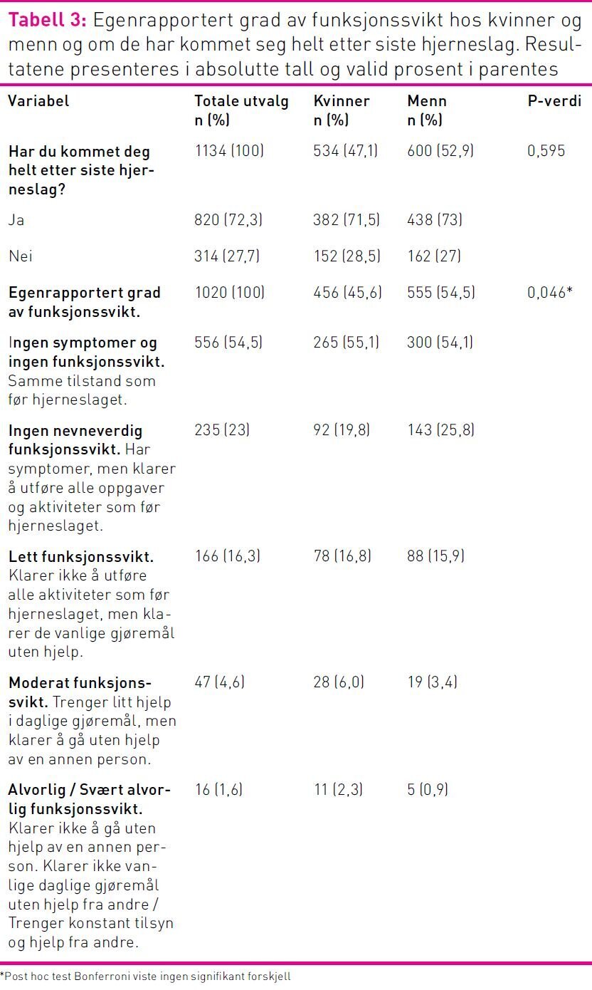 Resultat: 71,5 prosent kvinner og 73 prosent menn hadde kommet seg helt etter siste hjerneslag. Kun 6,2 prosent hadde svært alvorlig, alvorlig eller moderat funksjonssvikt. Kvinner ble sjeldnere innlagt på sykehus enn menn (p<0,001). Signifikant flere menn vurderte helsen som god etter hjerneslaget. Flere kvinner over 70 år brukte hjemmehjelp og hjemmesykepleie det siste året (p<0,001). Færre kvinner hadde venner som kan hjelpe dem (p=0,001).
