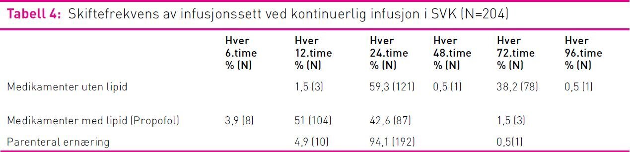 Praksis ved bytte av infusjonssett ved kontinuerlig infusjon varierte (tabell 4). Ved infusjon av medikament uten lipid var det 82 prosent av dem som jobbet ved lokalsykehus som byttet infusjonssett hver 24. time og 85 prosent av dem som jobbet ved universitetssykehus byttet hver 72. time. Ved infusjon av parenteral ernæring skiftet 94 prosent infusjonssett hver 24. time. Ved infusjon av Propofol® skiftet 55 prosent infusjonssett med seks til tolv timers mellomrom. Når det gjaldt tilhørende treveiskran var det kun 32 prosent som byttet den hver sjette til tolvte time. For ytterligere informasjon angående bytte av infusjonssett, se tabell 4.