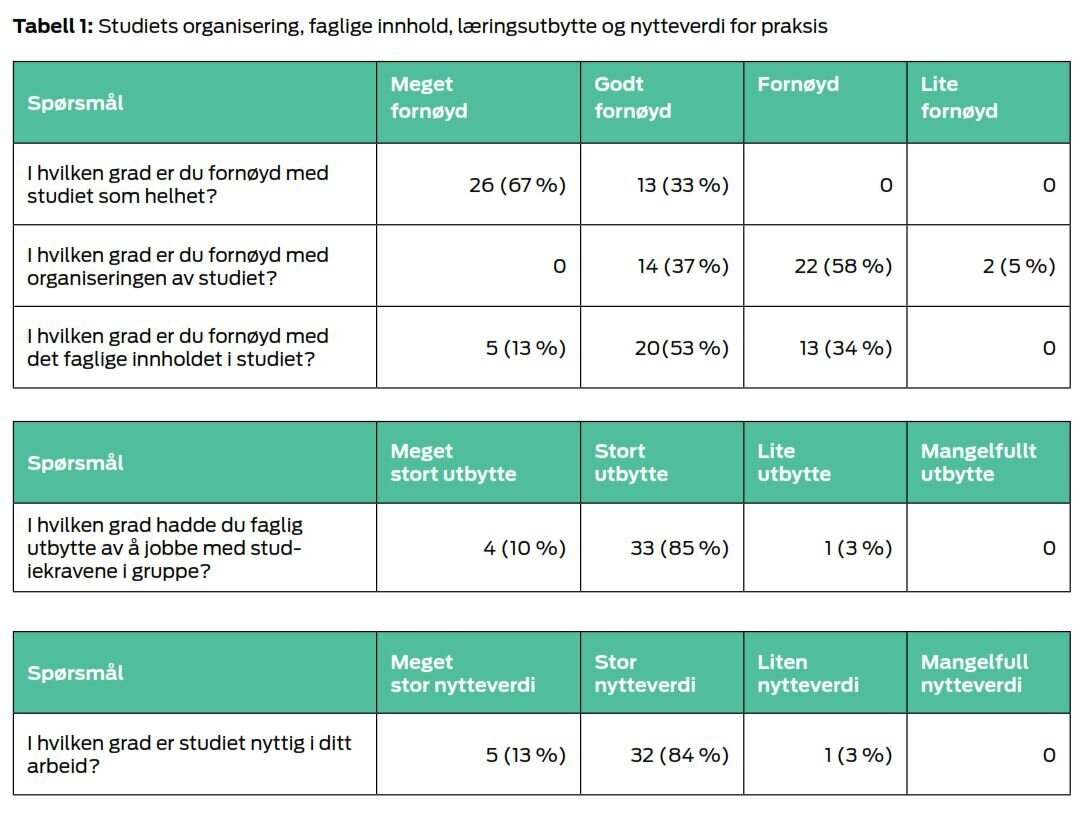 Ingen var misfornøyd med det faglige innholdet i videreutdanningen (se tabell 1). Flere hadde en bratt læringskurve, og det ble kommentert at læringsaktivitetene var faglig utfordrende, men samtidig motiverende. En deltaker skrev: «Alt var nytt og fremmed i begynnelsen, men nå har jeg følelsen av at dette vil jeg lære mer om».