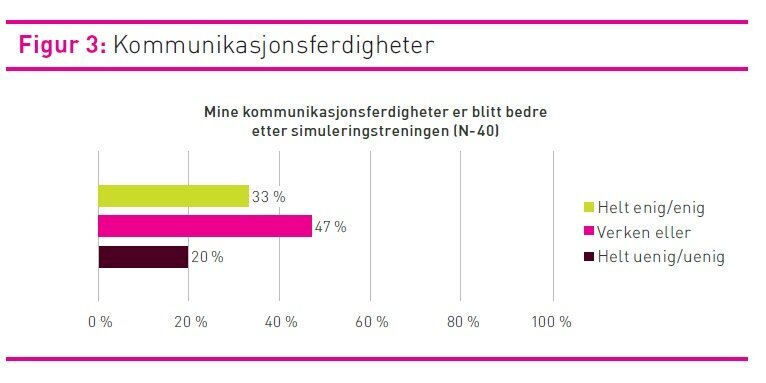 Studien tyder på at simulering økte forståelsen for hvordan kommunikasjonsmodellen kunne brukes, men ikke flere enn 33 prosent av sykepleierne vurderte at kommunikasjonsferdighetene var blitt bedre etter simulering. Kommunikasjon er imidlertid svært kompleks og omfatter flere dimensjoner enn bare bekreftende kommunikasjonsferdigheter. I studien valgte vi å fokusere på denne kommunikasjonsmodellen. Studiens design gir heller ikke svar på effekten på den direkte pasientpleien, noe som ikke var hensikten med studien.