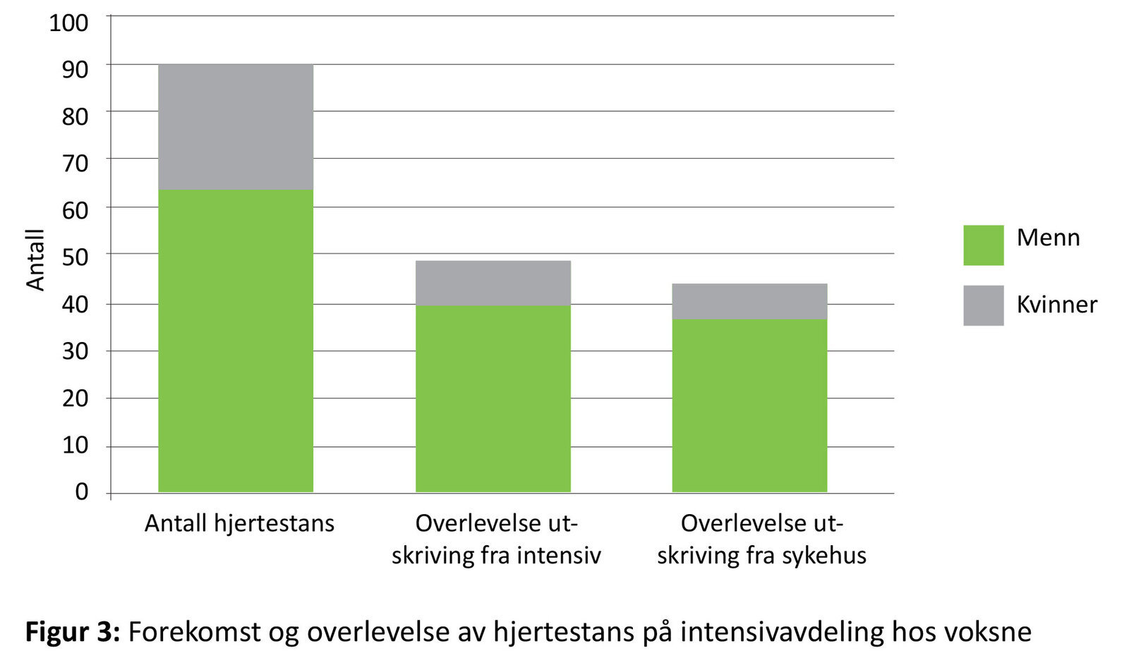 Resultat: Blant 15 101 intensivinnleggelser fant vi 117 (0,8 prosent) tilfeller av HLR fordelt på 99 pasienter. Av 91 voksne (> 18 år) var 64 (70 prosent) menn. Gjennomsnittsalderen var 63 år. Antall voksne som overlevde til utskrivning fra sykehuset var 44 (48 prosent). Overlevelsen for kvinner var signifikant lavere enn for menn: 8 (30 prosent) kvinner overlevde mot 36 (56 prosent) menn, (p = 0,023). Kun 32 (32 prosent) av alle pasientene var registrert i vårt interne hjertestansregister.