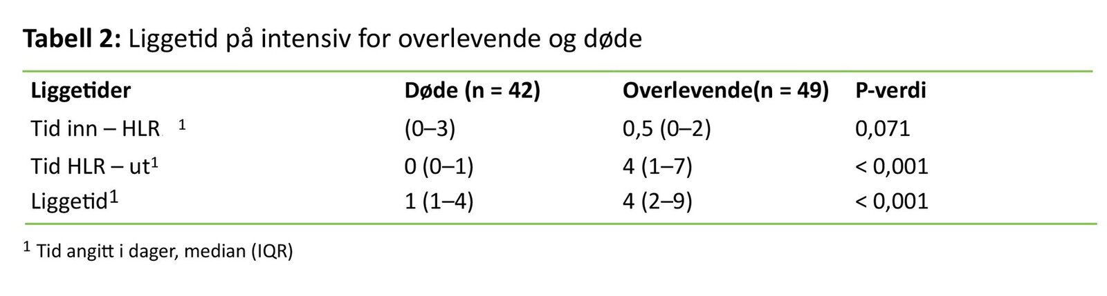 Tid fra HLR til utskrivning eller død var signifikant kortere for kvinner enn for menn (tabell 1). De som døde, hadde signifikant kortere tid fra HLR til utskrivning enn overlevende (tabell 2).