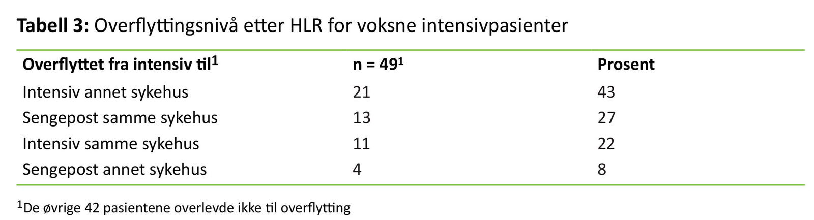 Etter utskrivning fra intensivavdelingene der HLR ble utført, ble overlevende pasienter som oftest overflyttet til en annen intensivavdeling, enten innad på sykehuset eller til annet sykehus. Et fåtall av pasientene ble flyttet videre til en sengepost etter hjertestans (tabell 3).
