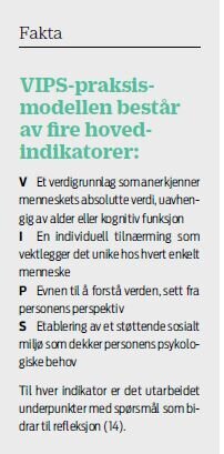 VIPS-praksismodell er et godt verktøy for ansatte til å yte personsentrert omsorg til personer med demens. Fagmøtet er egnet til å forstå utfordrende atferd ut fra pasientens perspektiv, foreslå miljøtiltak og fremme tverrfaglig samarbeid. Det er en forutsetning å kjenne pasientens bakgrunn – livsfortelling – for å yte personsentrert omsorg.